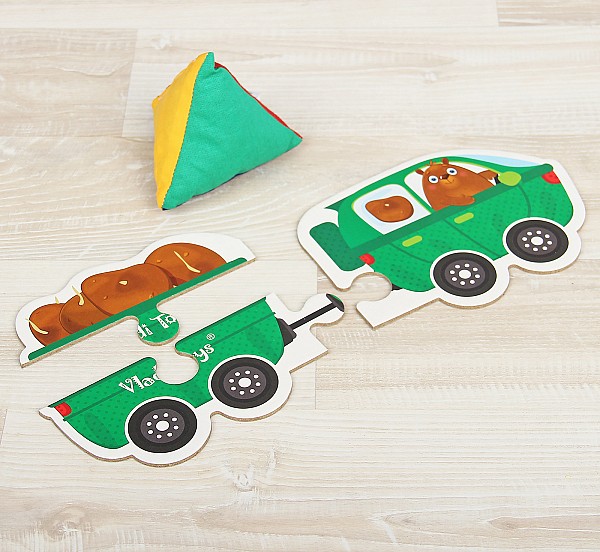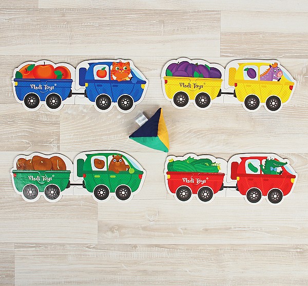 - Ребенку предлагается выбрать цвет на одной из граней пирамидки, а затем выстроить композицию из фигурок в соответствующем цвете, которая будет состоять из машинки с водителем зверушкой, прицепа и его груза.