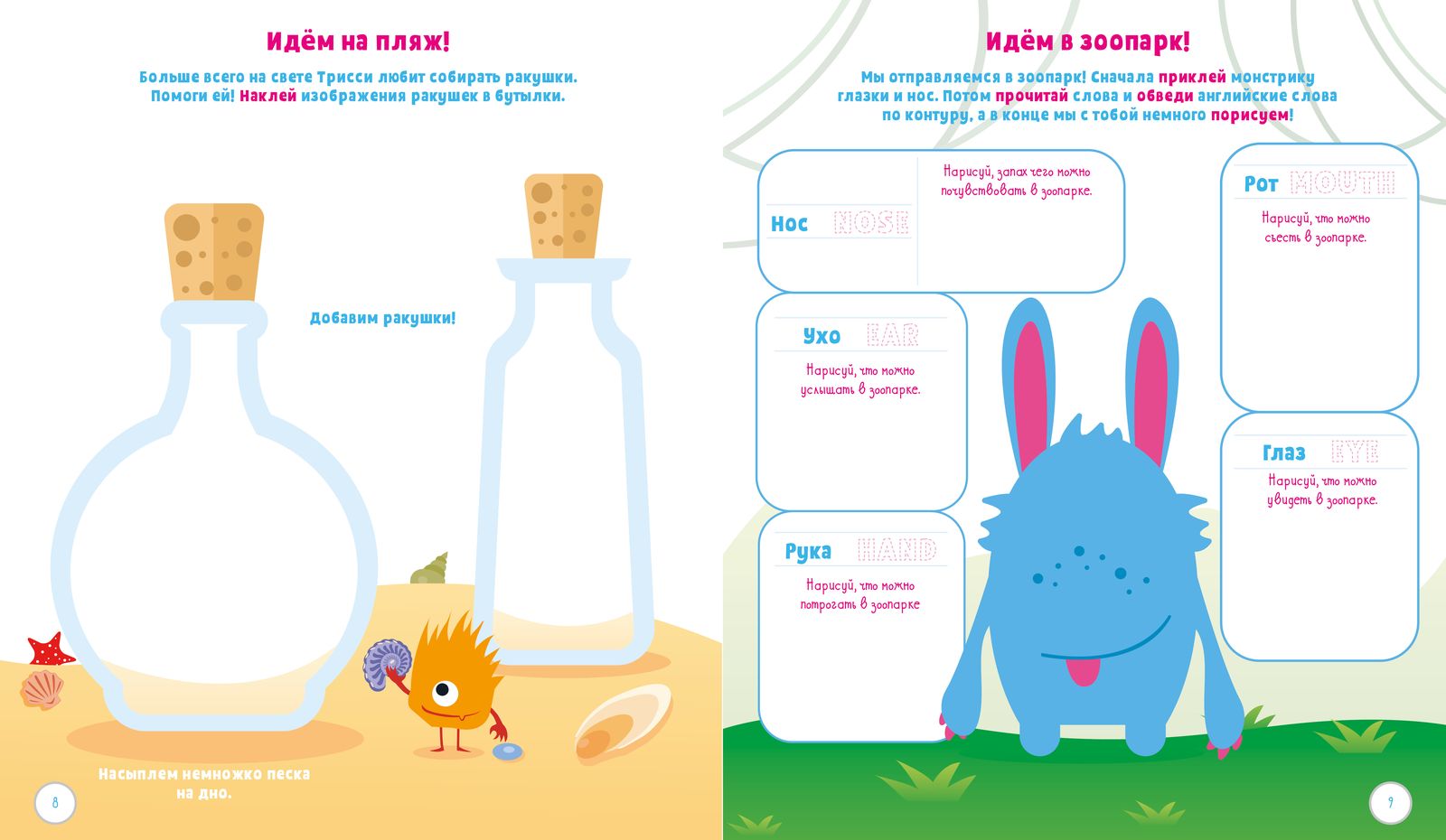 Все упражнения сопровождаются яркими рисунками — так малыш сможет долго сохранять интерес к занятиям, и очаровательными помощниками-монстриками — Брейни и его друзьями. Вместе с монтриком Рестом малыш научится правильно дышать, чтобы справляться с волнением. С Трисси заполнит наклейками-ракушками стеклянные банки. С Брейни выучит популярные английские слова.