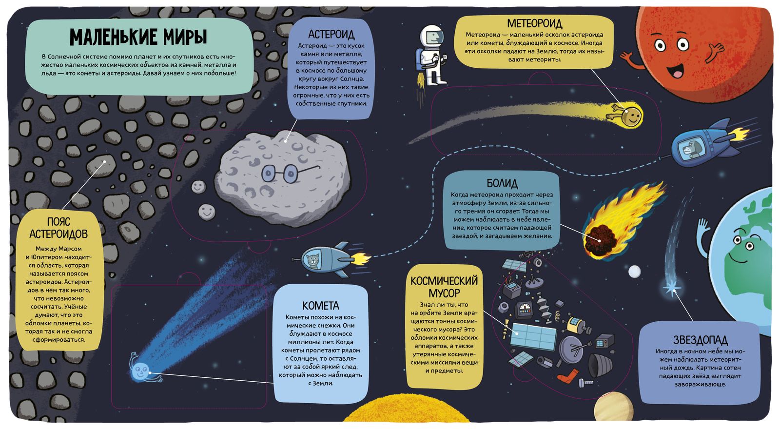 Как космонавты попадают в космос? Почему они в скафандрах? А кто первым полетел на Луну? А почему Солнце горячее? А что внутри у планет? На все вопросы маленького «почемучки» есть ответы в этой книге. На каждом развороте подробный и очень понятный рассказ о разных планетах, о смелых космонавтах, которые покоряли космос, и даже об инопланетянах, милых и симпатичных. Хочешь узнать, кто провалился в Черную дыру? Открой окошко и все увидишь.