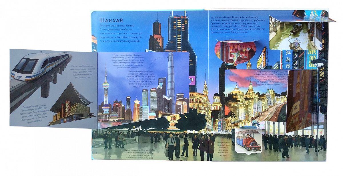 - Яркие и детальные иллюстрации, а также 70 створок, за которыми прячутся интересные факты о Лондоне, Нью-Йорке, Шанхае и других величайших городах мира.
