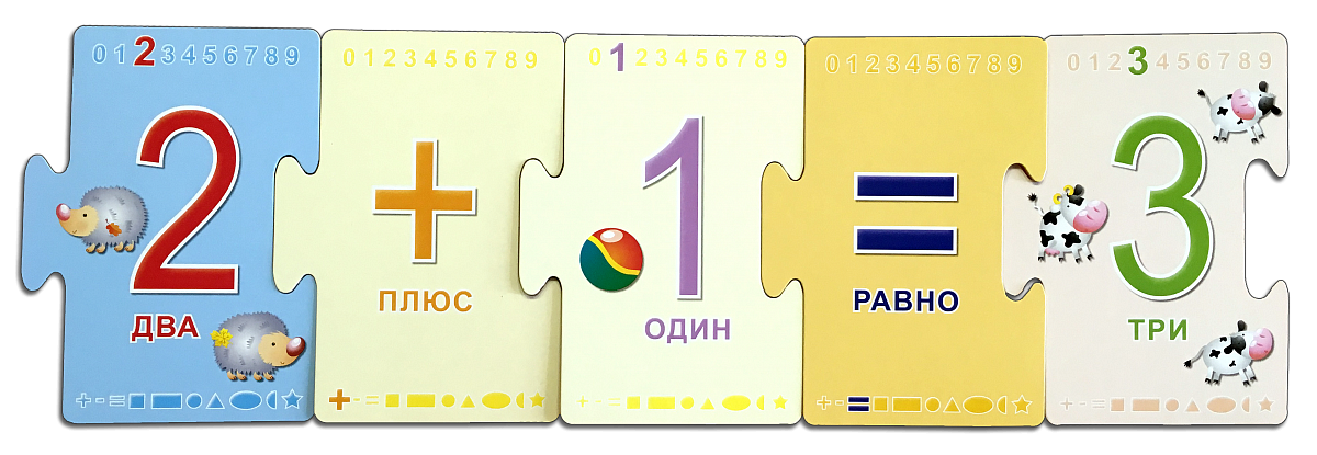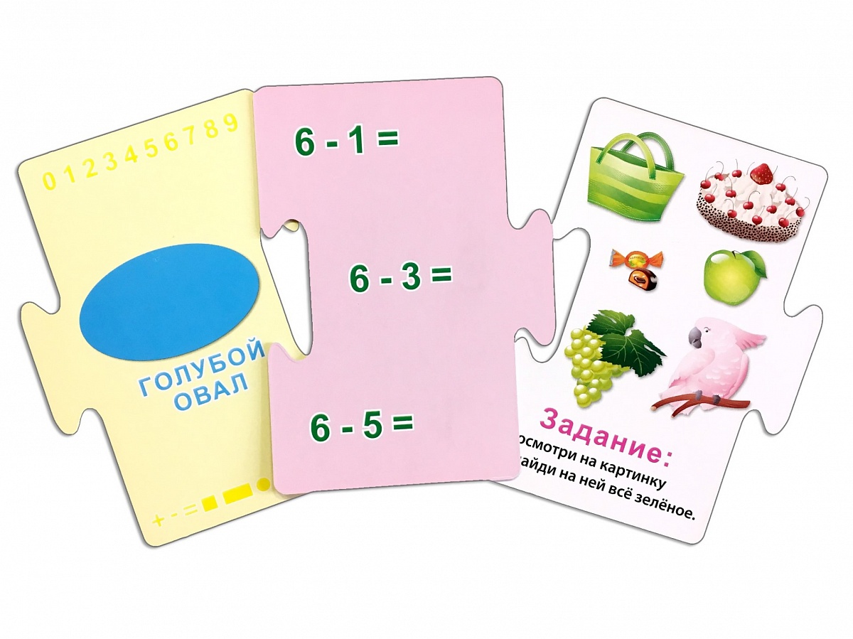- 36 двусторонних карточек-пазлов из плотного картона с красивыми большими картинками.С оборотной стороны карточек с цифрами есть уже готовые примеры, а на оборотной стороне карточек с цветными фигурами есть задания, которые нужно выполнить.