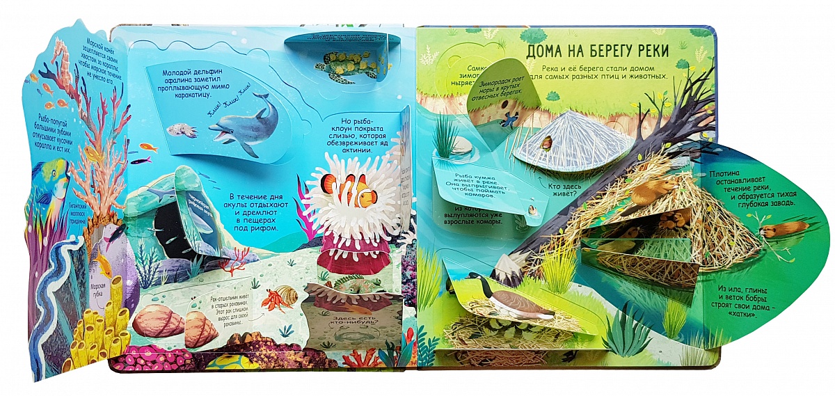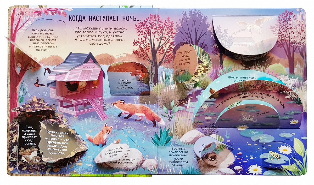 - Яркие и детальные иллюстрации, на которых можно подробно рассмотреть дома животных, а также получить сведения о других особенностях фауны.