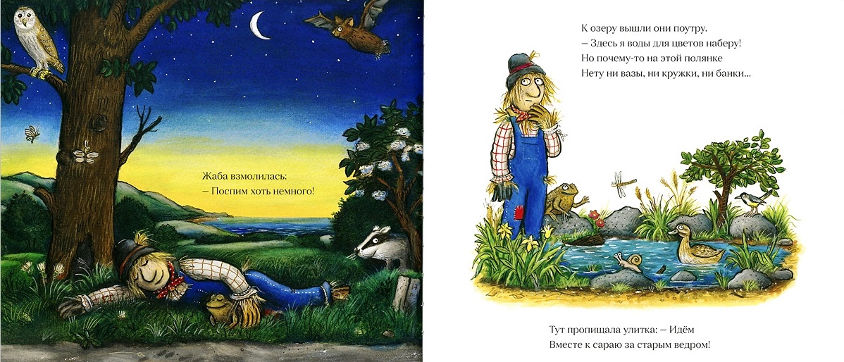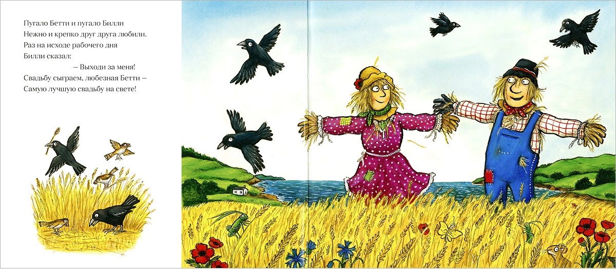 …"Согласна! Ура!" - сказала Бетти, и молодые принялись за приготовления. Портной паучок сшил пышное платье из белых как снег гусиных перьев. Коровы одолжили свои колокольца - чтобы весело трезвонить на свадьбе. Краб нанизал бусы из пестрых раковин. Шустрые мышки обшарили двор - добыли кольца от стареньких штор. Осталось нарвать большущий букет, и Билли отправился за ним. Но вот прошел один день, за ним второй, а Билли все нет. Бетти в тревоге: вдруг он другую навек полюбил? А между тем, фермер выставил в поле новое пугало - Гарри. Он франт и любезник и хочет расстроить свадьбу.