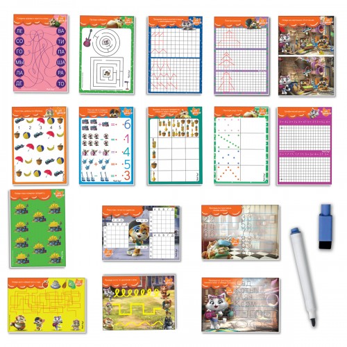 Игра с маркером из серии «44 Котенка» понравится деткам красочным оформлением с изображением героев мультика на полях. Вместе с любимыми персонажами ребенок будет рисовать, писать, блуждать по лабиринтам, сравнивать картинки и выполнять другие увлекательные задания.