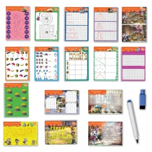 - Выполнять задания ребенок будет с помощью специального маркера в комплекте, а если совершит ошибку, то всегда сможет ее исправить, просто вытерев надпись губкой.