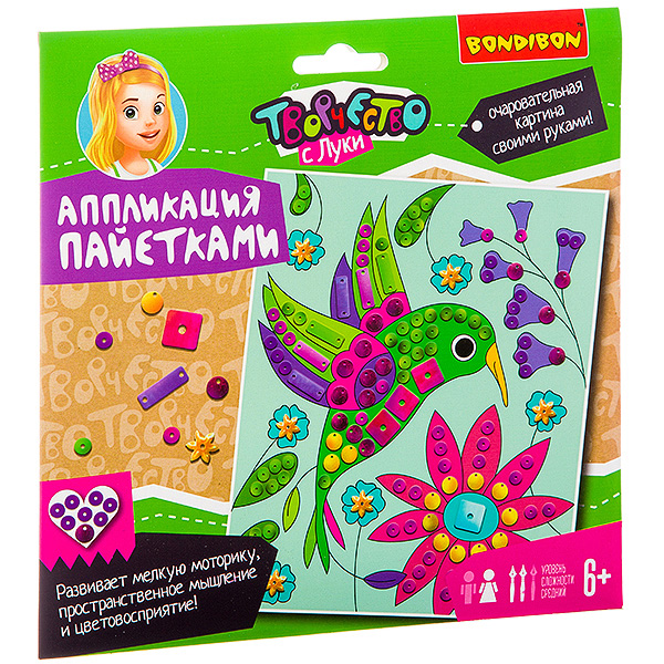 Набор включает в себя карту - основу с ярким рисунком, которую необходимо дополнить и украсить сочетанием разноцветных пайеток, закрепив их на основе с помощью объемного двустороннего скотча.