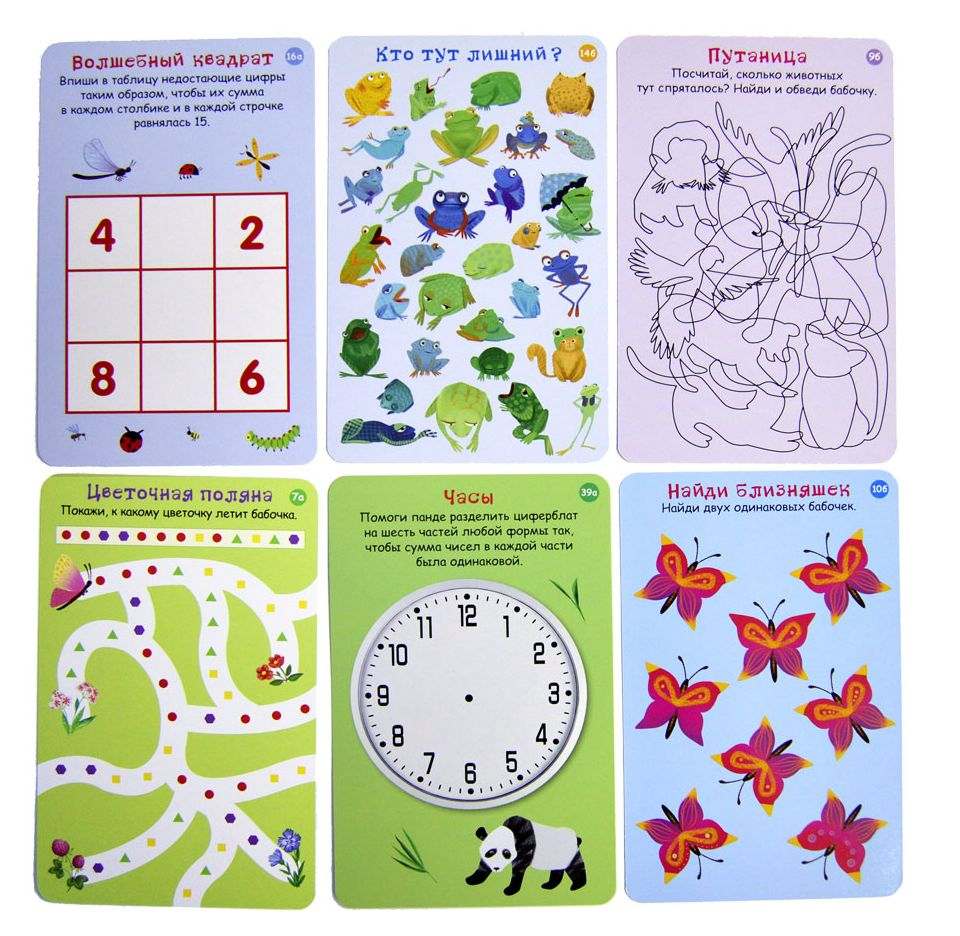 В набор входит 50 двусторонних многоразовых карточек с заданиями на сообразительность: логическими задачками и головоломками, играми на внимание, память, воображение, кроссвордами и лабиринтами, задачками на счёт, чтение и письмо, а также интересными заданиями для рисования.