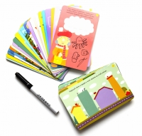 - 50 двусторонних многоразовых карточек, карточки с ответами и маркер на водной основе для работы с набором.