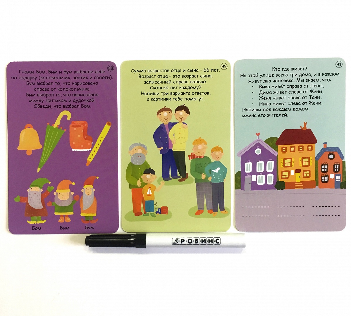 - 50 двусторонних многоразовых карточек, карточки с ответами и маркер на водной основе для работы с набором.