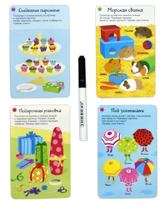 - 50 двусторонних многоразовых карточек, карточки с ответами и маркер на водной основе для работы с набором.