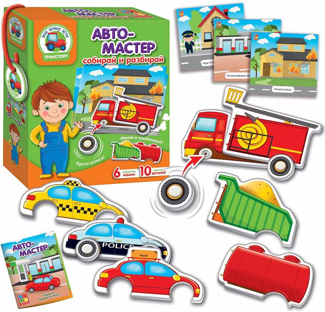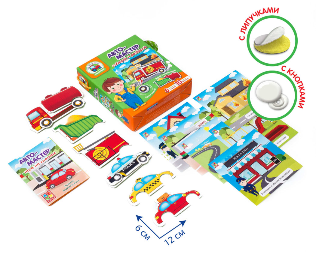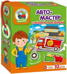 Благодаря игре «Автомастер» от компании «Vladi Toys» любознательные исследователи окружающего мира научатся безошибочно определять вид машины, сможет рассказать о ее назначении и отличительных особенностях. Машинки, которые ребенок будет собирать в процессе игры, имеют подвижные элементы на кнопках и липучках.
