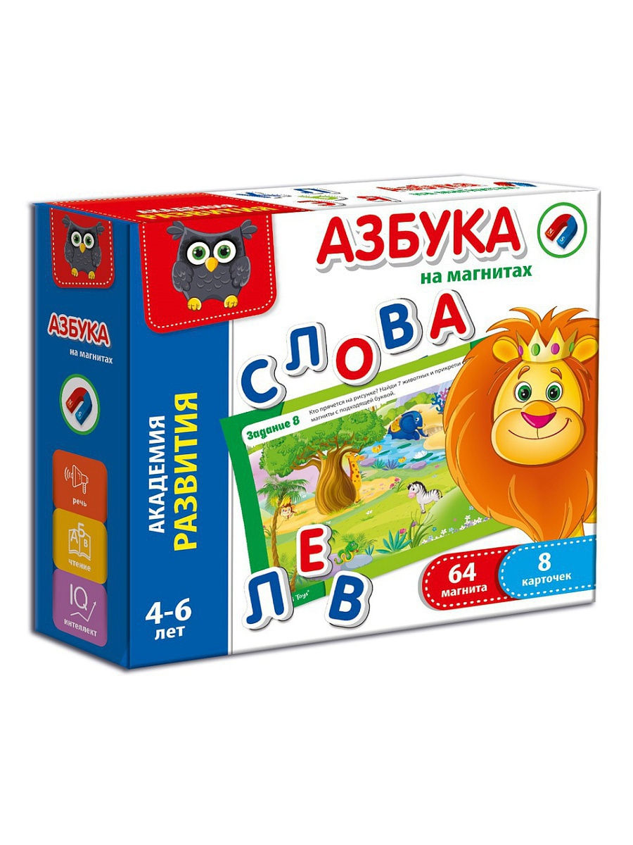 Магнитные буквы помогут ребенку освоить азбуку. На карточках есть задания. Они будут служить цветным пособием и помогут маме самостоятельно проводить занятия. Общайтесь с помощью магнитов, оставляйте друг другу сообщения на холодильнике. Употребляемые буквы дублируются. Магниты имеют объем. Они легкие и мягкие. С игровым набором малыш быстро запомнит буквы, научится читать и составлять слова.