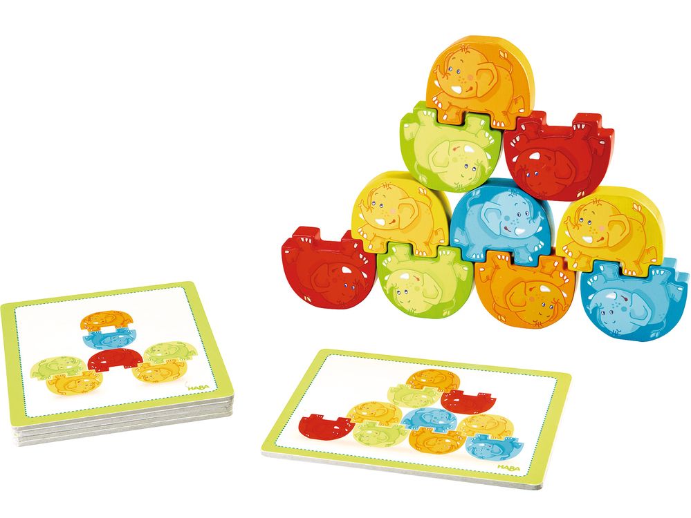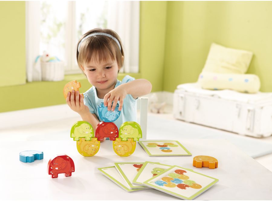 Веселое развлечение с балансирующими слониками, ведь они могут быть расставлены друг на друга по-разному: непростая задача для всех маленьких "строителей". Двусторонние карточки с шаблонами показывают задачи различной степени сложности.