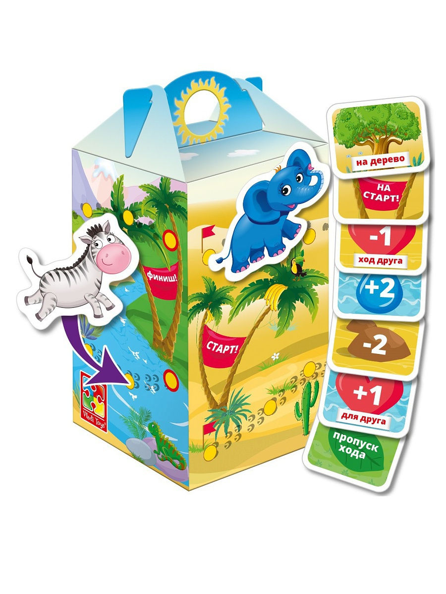 Необходимо прикрепить желтые липучки к коробке, а белые к игровым фишкам. В игре 4 героя в виде африканских животных. Игровые фишки определяют количество ходов. Побеждает тот, кто придет к финишу первым. Полные правила игры размещены в инструкции.