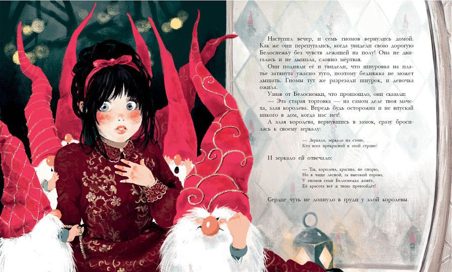 Белоснежка - героиня одной из самых любимых сказок. Она хрупкая, доверчивая и очень красивая. Она смотрит на мир огромными удивлёнными глазами, сквозь которые видна вся её чистая открытая душа. Именно такой предстаёт перед нами Белоснежка в иллюстрациях Екатерины Ефремовой. А гномы у молодой художницы выглядят милыми пушистыми бородачами - сразу видно, что они очень добрые. Изогнутая бровь и то надменный, то гневный взгляд красивой женщины, застывшей перед зеркалом... Кто это? Это злая королева, мачеха Белоснежки. Она прекрасна, но её красота - лишь маска для чёрного сердца.