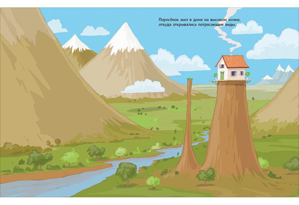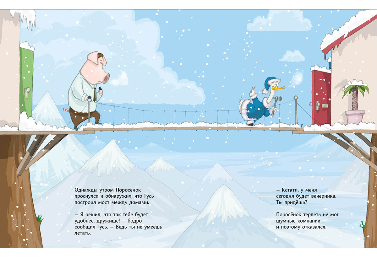 Поросёнок живёт один на высоком холме. Ему нравится печь пироги, читать книжки и собирать пазлы. А больше всего на свете он любит свой уютный дом и чудесный вид из окна. Точнее... ЛЮБИЛ. До тех пор, пока на соседнем холме не поселился этот шумный, навязчивый Гусь! Его послушать - так он везде побывал и всё повидал, даже те места, о которых Поросёнок только в книжках читал. Он просто ужасный сосед! Но без него немного? как бы сказать? даже странно, но БЕЗ НЕГО скучно!