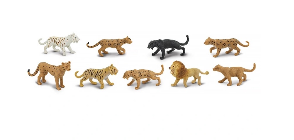 Набор из 8 фигурок хищников семейства кошачьих: лев, тигр, белый тигр, ягуар, черная пантера, пума, гепард, леопард и оцелот. Размер фигурок варьируется от 4 до 7,5 см. Возраст: 3+