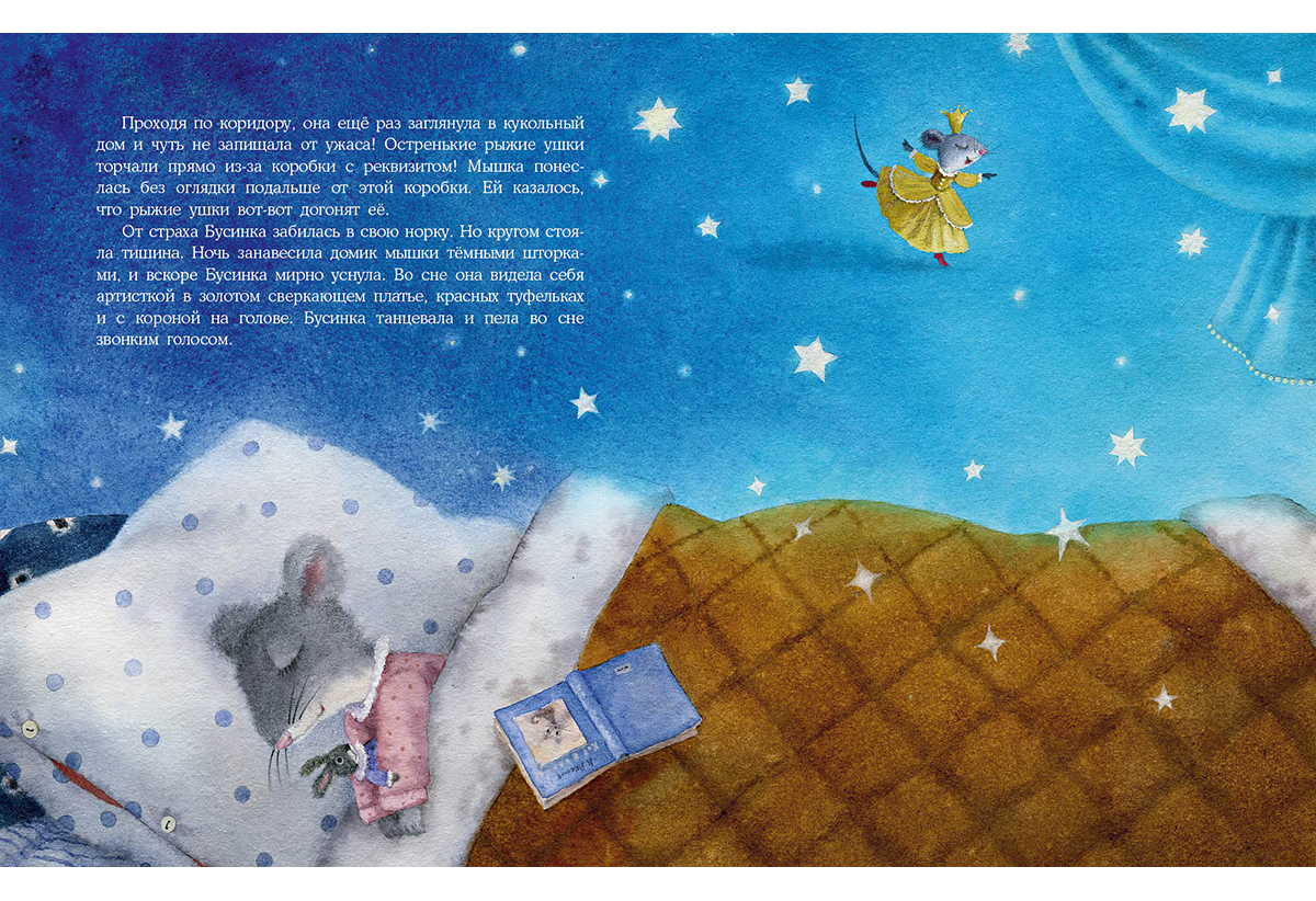В театре кукол жила маленькая мышка по имени Бусинка. Она с удовольствием смотрела все спектакли и знала всех кукол по именам. Бусинка мечтала стать настоящей артисткой! Мышка представляла себя в золотом сверкающем платье, красных туфельках и с короной на голове. И однажды она услышала, что на главную роль срочно нужна артистка?