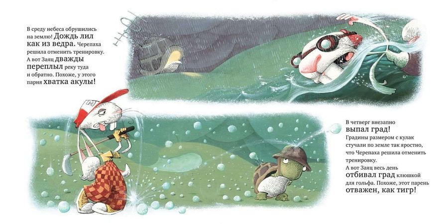 Вы с малышом станете свидетелем матча-реванша между чемпионом Черри «Шевелись Уже» Черепахой с фирменным стилем «Тише едешь, дальше будешь» и Гарри «Ураганом» Зайцем, которого отличает «Прыть и натиск». Целую неделю герои готовятся к битве, встречая массу препятствий на своем пути. И вот день X настает. Кто же станет победителем? И удастся ли Зайцу отобрать у Черепахи чемпионский титул? Об этом вы узнаете только в конце книги «Черепаха и Заяц: матч-реванш!». А потом вместе с уставшим от такой нервотрепки, ведущим Джонни Лисом, отправитесь спать.