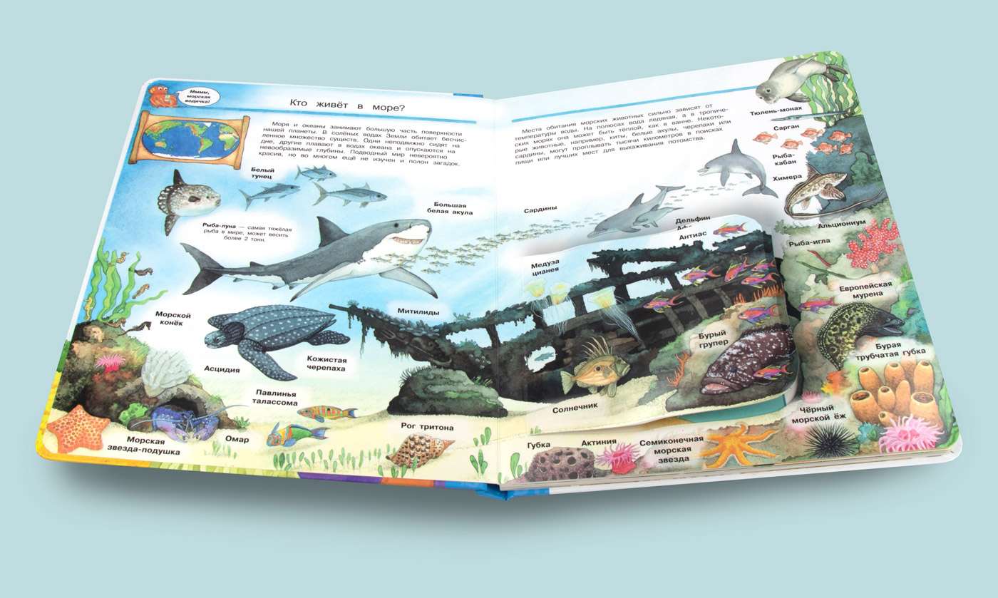 Каждый книжный разворот энциклопедии насыщен массой интереснейшей информации, красочно и занимательно описывающей жизнь морских животных. Здесь можно найти простые и понятные ответы на вопросы: какие животные обитают в морях, чем они питаются, как охотятся и как защищаются, кто живёт на морском дне и кто такие двужаберные моллюски, какие морские обитатели самые большие, а какие самые умные, как появляются коралловые рифы и кто живёт на большой глубине.