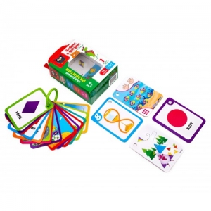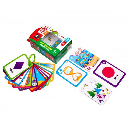 Покажите малышу карточки по очереди. На них изображены цифры в виде предмета или явления. А с обратной стороны – то же количество предметов, которое обозначает цифра. На части карточек вы увидите разноцветные фигуры. Читайте ребенку их названия, а он пускай за вами повторяет. На обороте карточек-фигур вы найдете предметы, которые по форме повторяют эти геометрические фигуры. Они помогут малышу легко запомнить, как выглядит каждая из них.