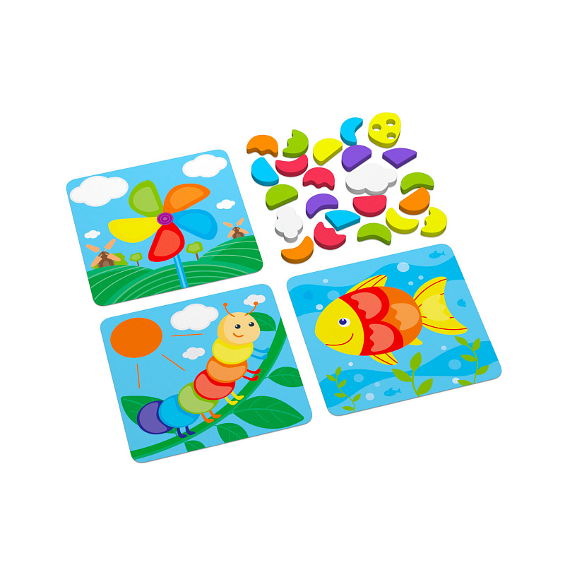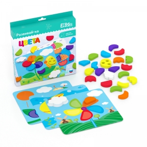 Развивающая игра «Цвета» представляет собой яркие карточки, на которых изображены красочные картинки - звонкие птички, веселая гусеница, улыбчивая рыбка и другие. Также в комплект игры входят детали разных форм и цветов, выполненные из ЭВА материала.