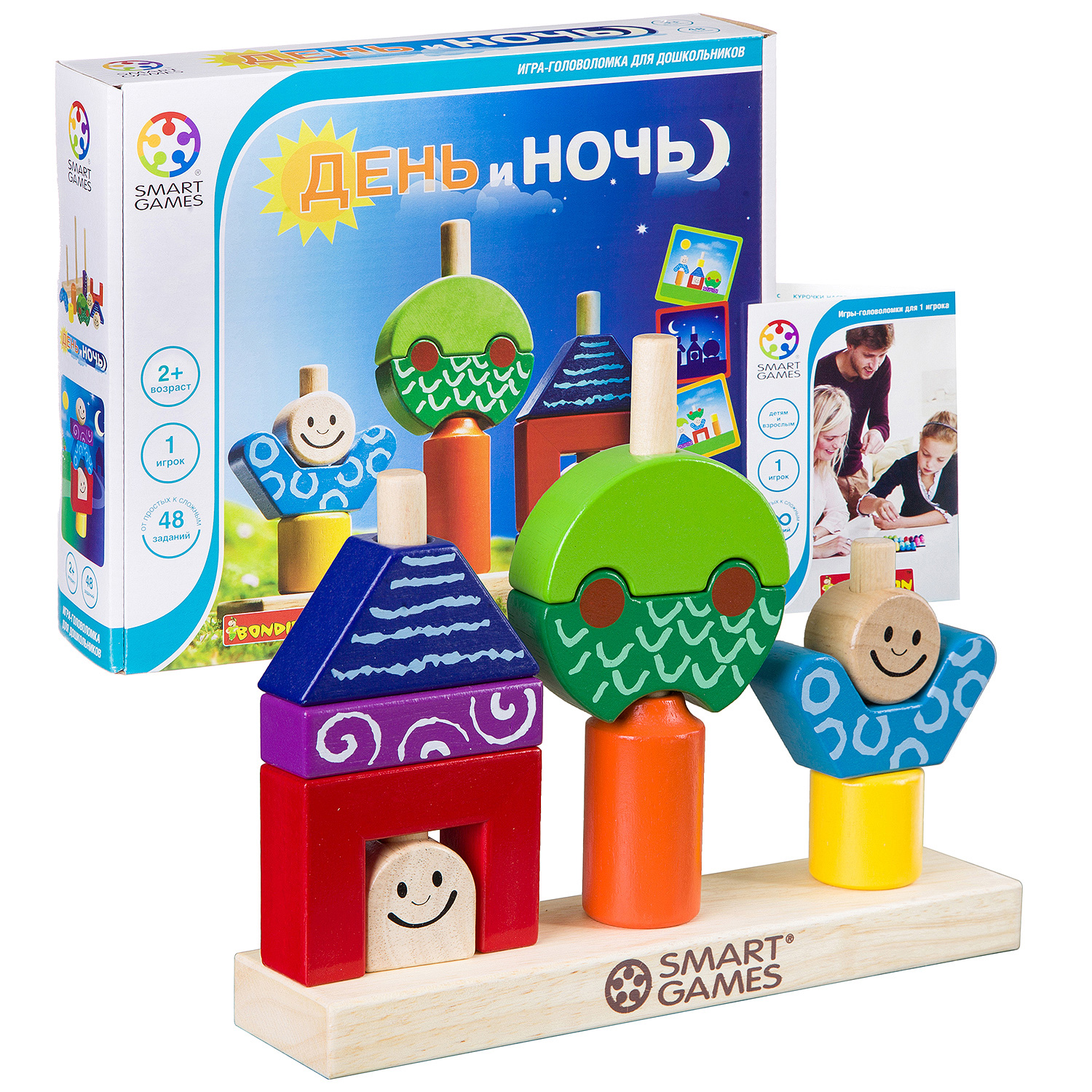 Красочная игра для малышей "День и ночь" - это яркие и необычные, приятные на ощупь деревянные детали конструктора-головоломки для детей от двух лет.