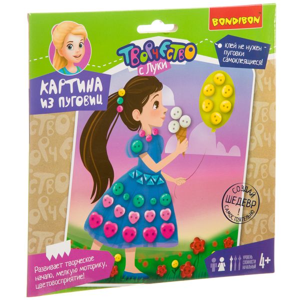 Красочные самоклеящиеся пуговки разных размеров легко крепятся к основе, создавая объемный сюжет.