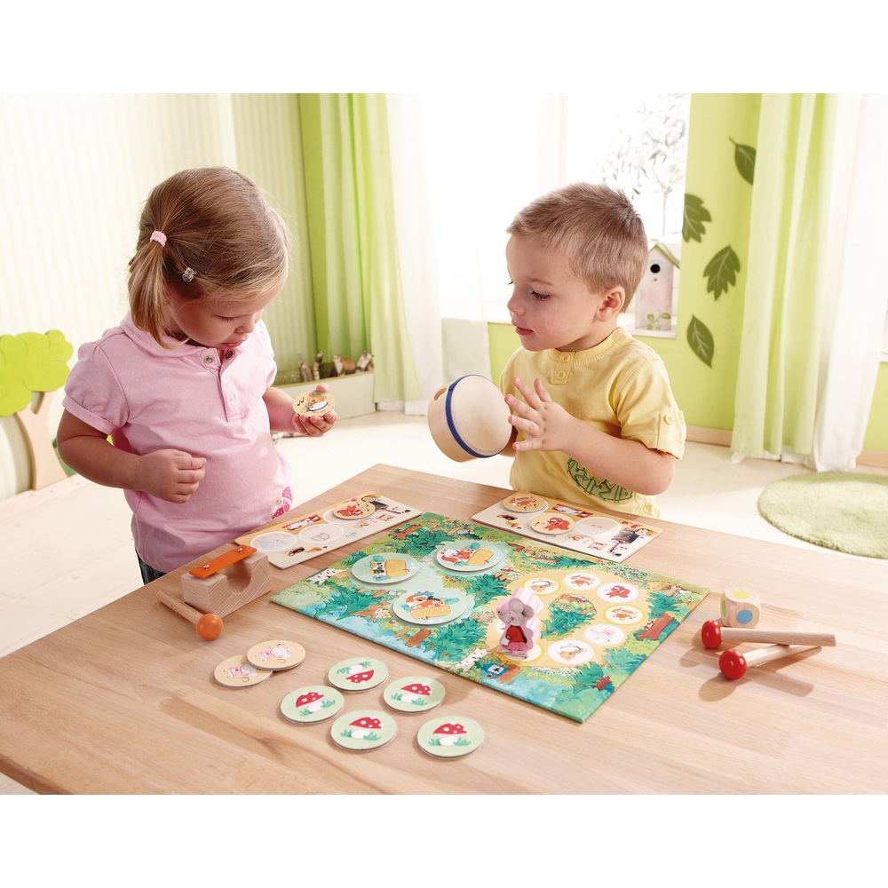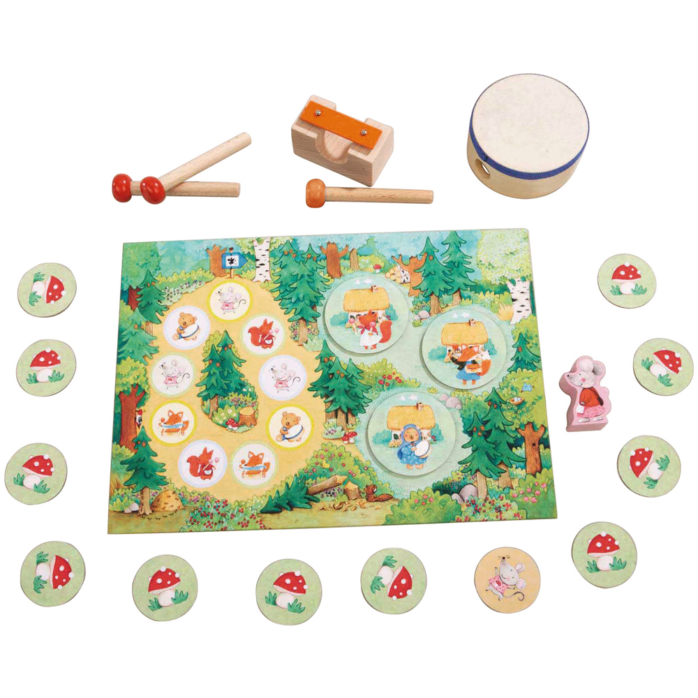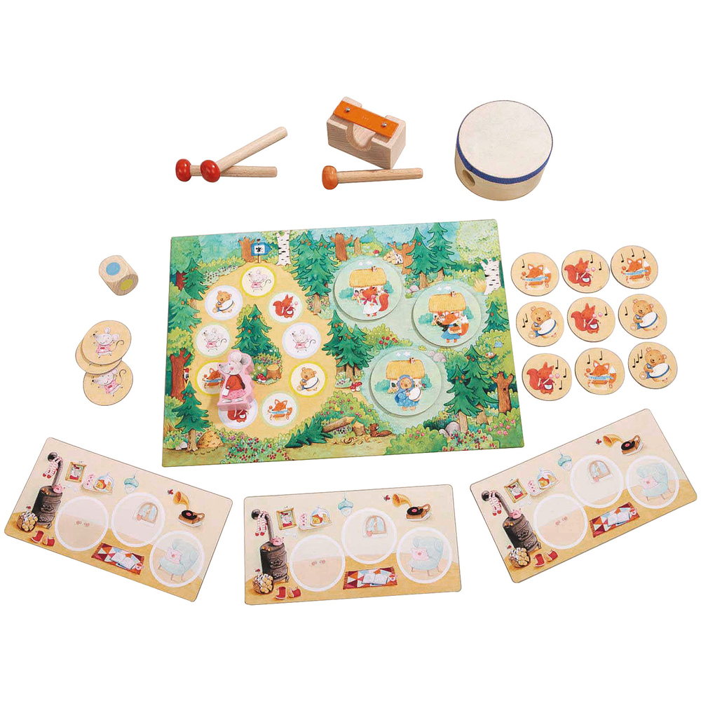 Комплектация: 1 Мама мышка, 1 бубен, 1 металофон и молоточек, 1 пара ударных палочек, 1 игровое поле, 3 лесные мыши, 3 кубика мышки Миа, 9 кубиков животных, 3 домика мышки, 1 цветнок кубик, инструкция