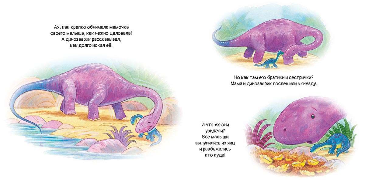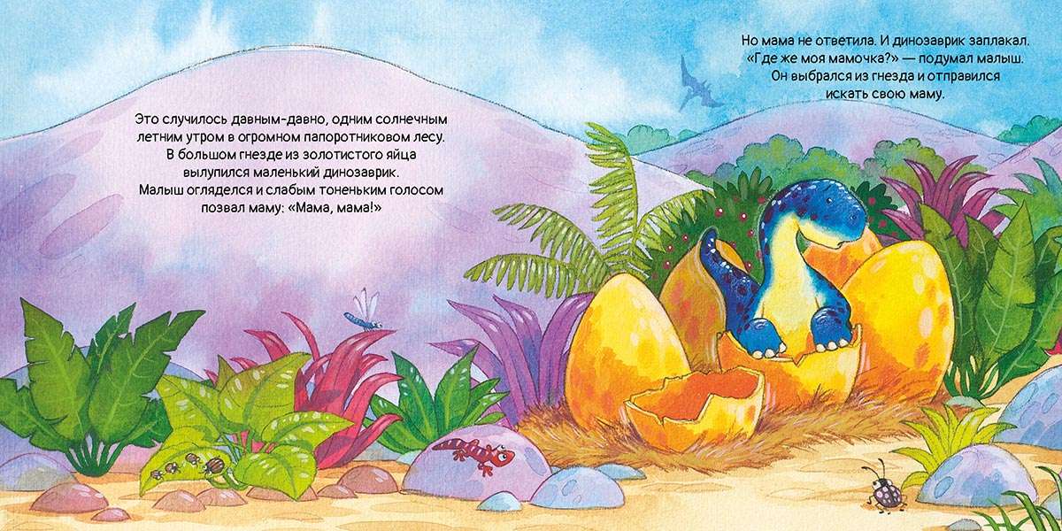 Маленький динозаврик появился на свет в густом папоротниковом лесу. Он посмотрел по сторонам и позвал маму, но она не ответила. И тогда отважный детёныш отправился на её поиски. Это книга-загадка для самых маленьких — поиграйте с ней: рассмотрите с вашим малышом каждую картинку и помогите динозаврику отыскать мамочку. Ведь мамы никогда не теряются — они всегда рядом! ≪Сказки на ночь≫ — популярные классические и новые сказки для малышей_— создадут атмосферу тишины, уюта и волшебной тайны. С этими великолепно иллюстрированными историями так легко засыпать, а сон приходит приятный и_здоровый. Спокойной ночи!