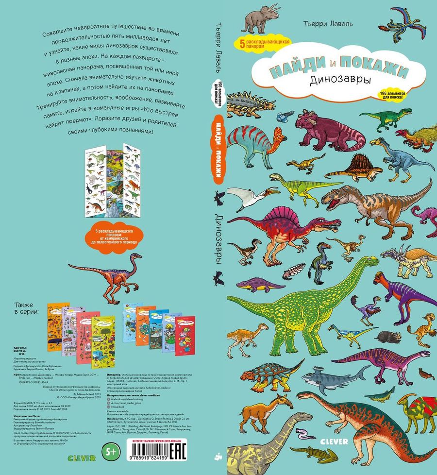 • Книга «Найди и покажи. Динозавры» — это 5 раскладывающихся панорам и 196 предметов для поиска!