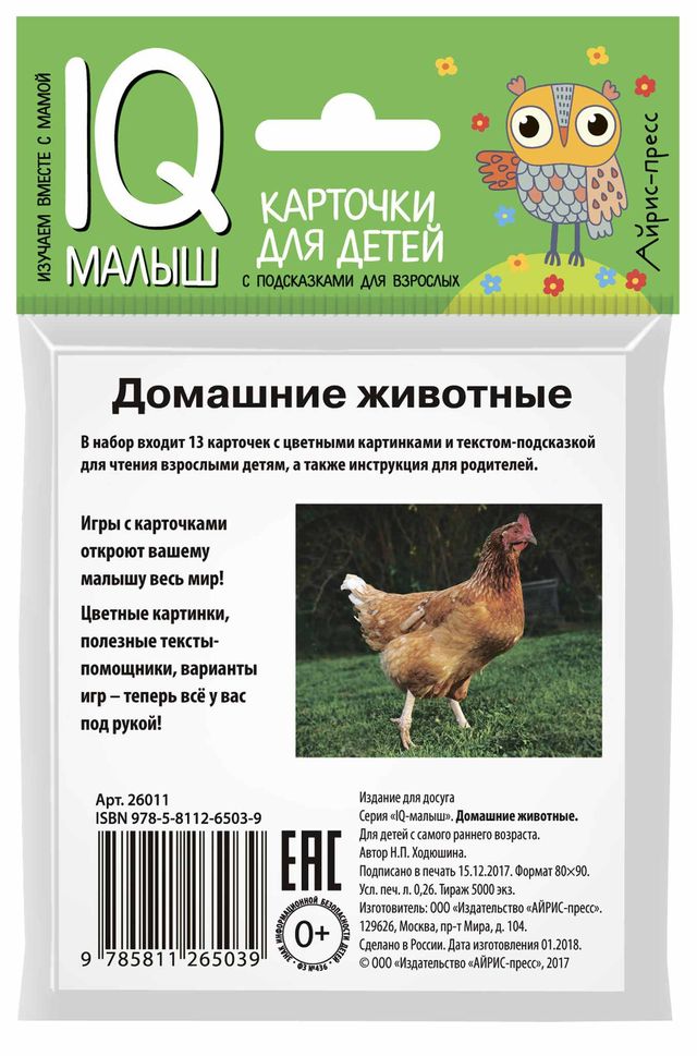 Набор двусторонних карточек познакомит ребёнка с домашними животными. В комплект входит 13 карточек с цветными изображениями животных и текстом-подсказкой на обороте для чтения взрослыми детям, а также карточка с инструкцией для родителей. Игры с карточками развивают память, зрительное и слуховое восприятие, расширяют словарный запас, формируют интеллект.