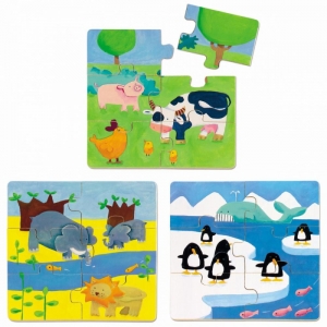 - Деревянная игрушка представляет собой набор деталей со скругленными для безопасности углами с фрагментами изображений, из которых ребенок сможет собрать 3 красочных картинки.