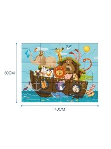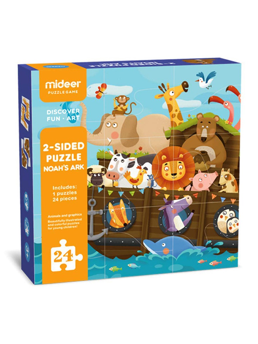 Двусторонний паз "Ноев ковчег" от компании MiDeer - состоит из 24 элементов сделанных из плотного картона. Размер пазла в собранном виде 30х40 см. С одной стороны малышу необходимо собрать красочный пазл, на котором изображены спасенные Ноем животные, однако перевернув элементы пазла у ребенка появится еще одно задание: найти каждому животному по паре. У вас так же появится отличная возможность рассказать о Ное и о том, как он спас животных во время Великого потопа. Пазлы развивают логику, усидчивость, мелкую моторику, память, концентрацию внимания.