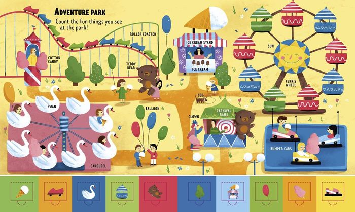 Каждый разворот — большая сюжетная иллюстрация! Вас ждет солнечный пикник, шумный зоопарк, лесные прятки и морские приключения! Сосчитайте все новогодние подарки, помогите обезьянке и пиратам уплыть с далекого острова, посетите магазин игрушек и сосчитайте все, что только увидите! Веселые окошки-клапаны превратят обучение в увлекательную игру.