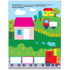 С помощью этой книги малыш познакомится с основными геометрическими формами, научится различать и называть их (в домик нужно наклеить квадратные окошки; возле озера с утятами – овальные кроны деревьев и камыш и т. д.).