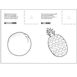 Раскраска "Фрукты" содержит изображения: яблоко, груша, банан, апельсин, ананас, лимон, персик, вишня.