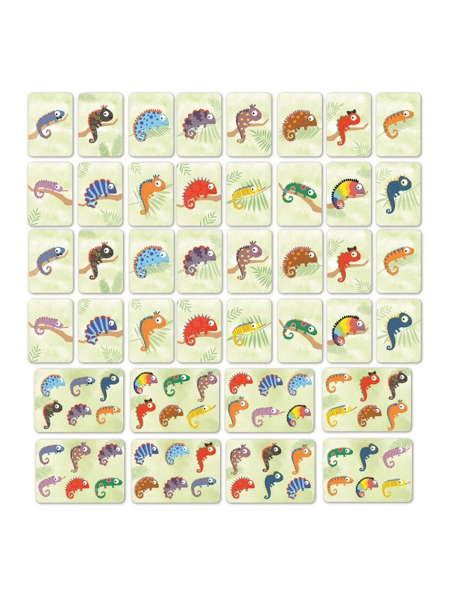 Настольная игра на внимание Хамелеон состоит из 8 игровых полей, на которых нарисовано по шесть ящериц разного цвета, и 32 карточек с изображением этих же пресмыкающихся.