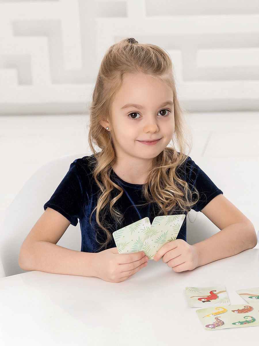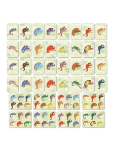 Ребенок выбирает одно из игровых полей и старается запомнить всех хамелеонов, что на нем изображены, а затем среди всех карточек ищет именно своих ящериц.