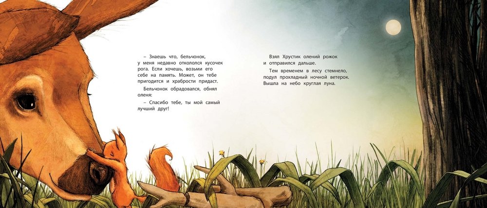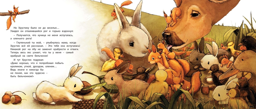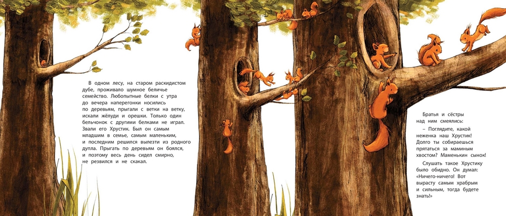 Маленький бельчонок Хрустик был таким робким, что братья и сёстры смеялись над ним и дразнили «маменькиным сынком». И вот однажды он собрался с духом и выбрался из гнезда. Он попробовал побыть кроликом, уткой, дроздом и даже оленем. Но, конечно, в конце концов бельчонок понял, что лучше всего быть самим собой. К тому же он сумел преодолеть свою робость и стал самым храбрым бельчонком на свете!