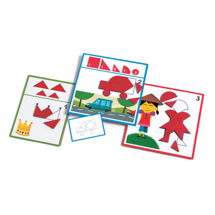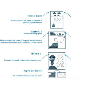 Набор состоит из шаблонов, на которые ребенок должен наложить отдельные части (фигуры). Главная задача – правильно скомпоновать детали. Двусторонние карточки имеют три уровня. На маленьких карточках есть подсказки для ребенка - каким образом нужно собирать фигуры вместе.