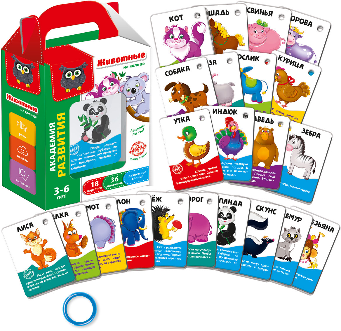 - В наборе ребенок обнаружит карточки из плотного картона с красочным изображением животных.