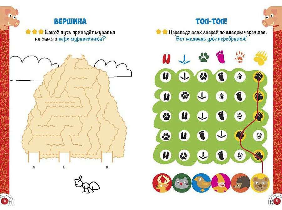 В книге «Ищу выход» малышам предстоит исследовать замысловатые лабиринты, при этом они столкнутся с множеством препятствий, преодолевая которые они помогут выиграть олимпийские медали атлету; затем в компании с почтальоном поучаствуют в доставке писем, не перепутав адреса; а еще сумеют составить точный маршрут к собору для настоящего епископа.