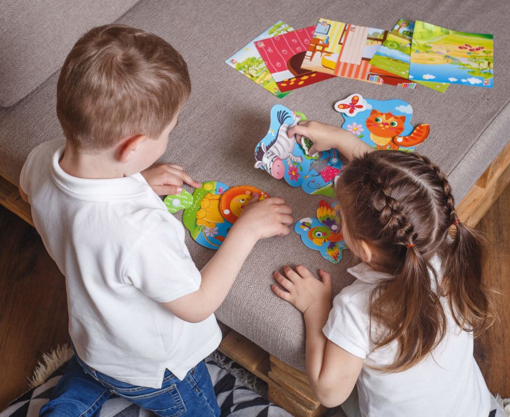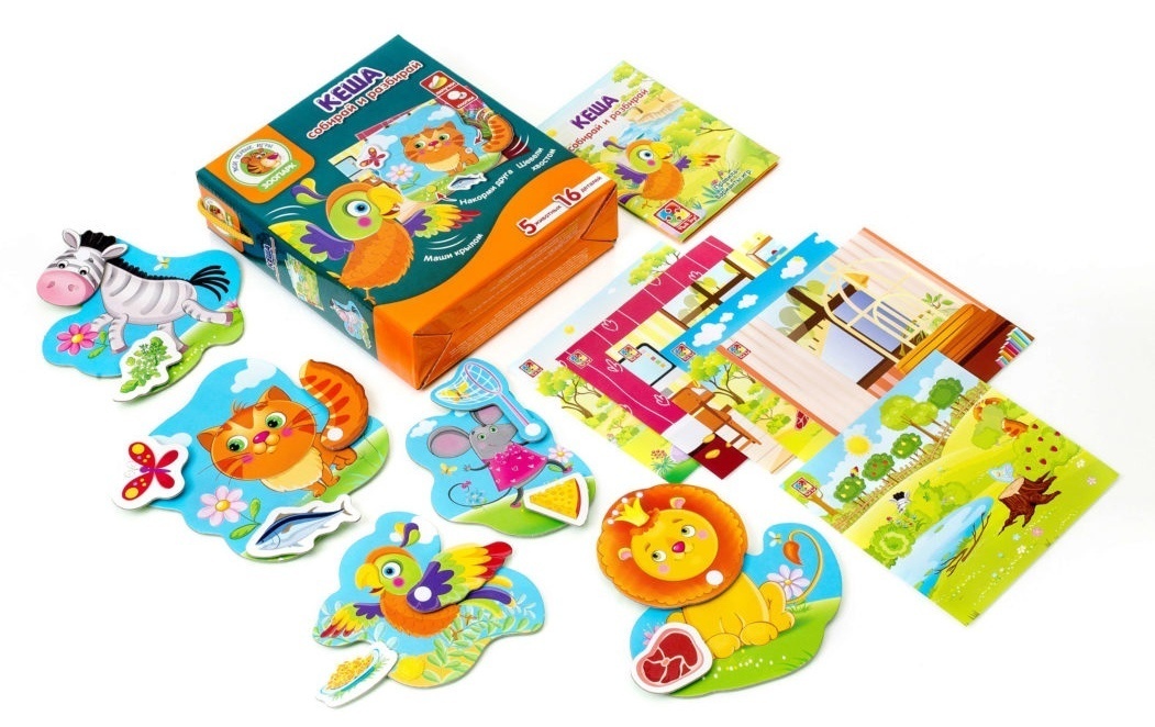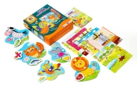 - Помимо картонных деталей в наборе находятся 6 карточек с изображением разных мест обитания, предложите ребенку подобрать к каждому животному характерный фон.