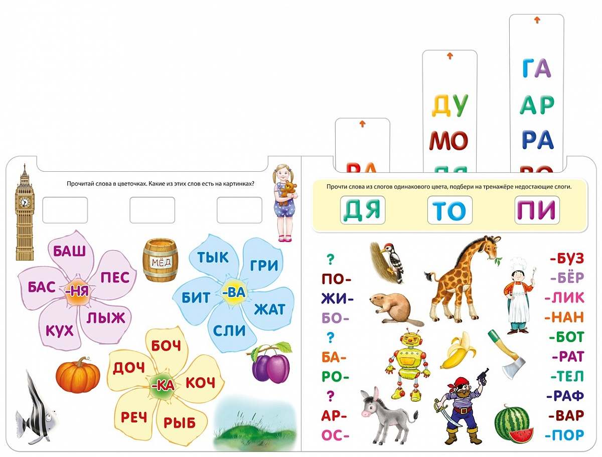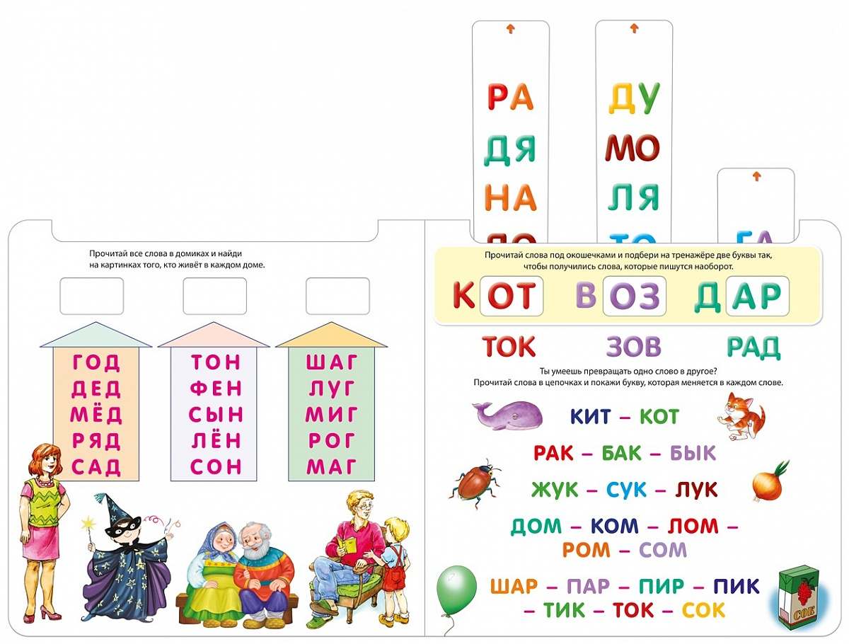 - Красочные тематические развороты и множество интересных заданий:подбери слогу пару, составь слова из слогов, прочитай и найди, преврати одно слово в другое, найди, чем отличаются слова, прочитай наоборот и другие.