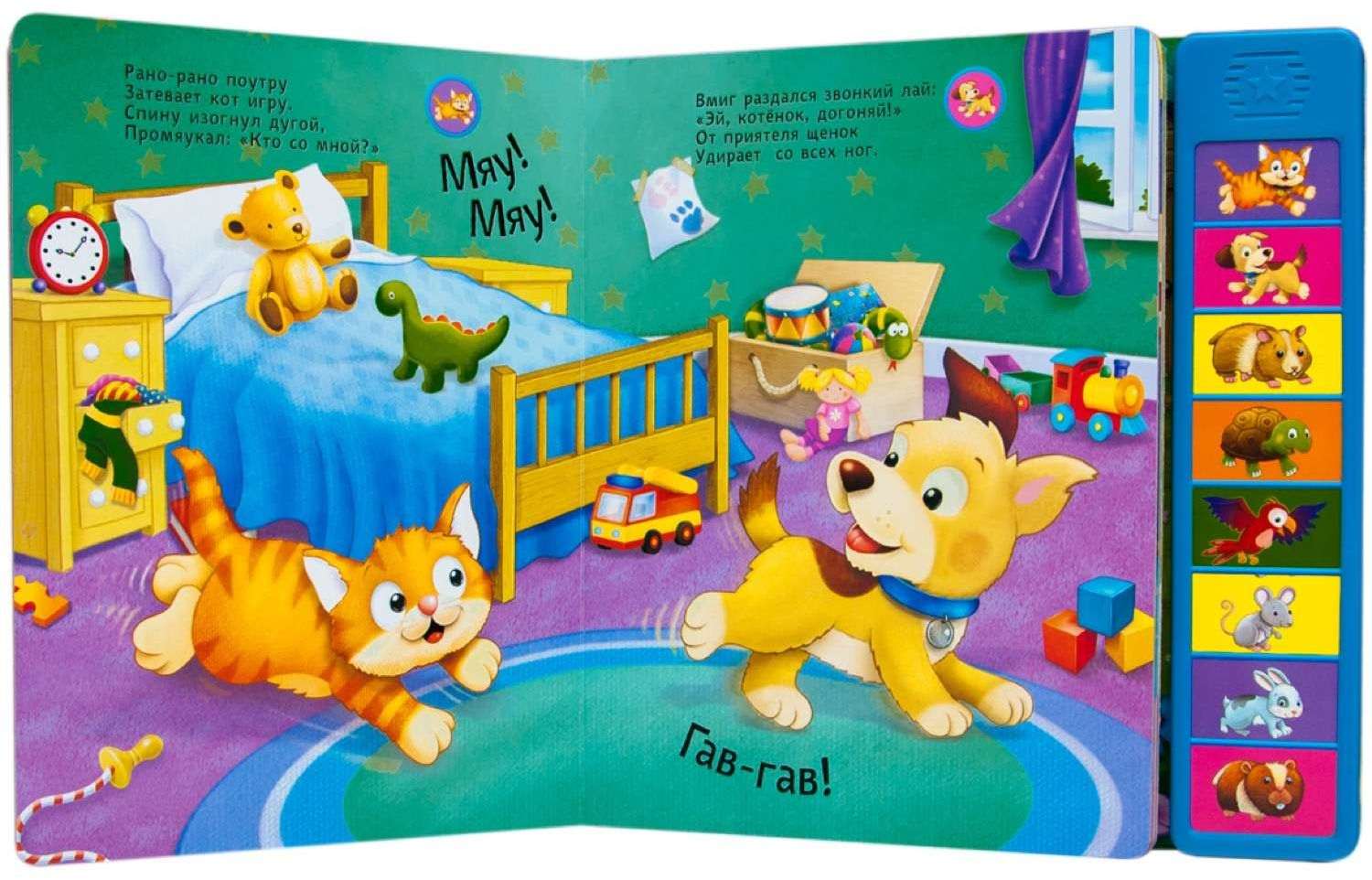 Замечательная звуковая книжка «Домашние питомцы» обязательно понравится Вашему малышу. Добрые стихи расскажут ему о веселой игре озорного котенка и его друзей.