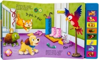 Нажимая на кнопки, ребенок сможет послушать 8 разных звуков: мяуканье котенка, лай щенка, крик попугая и другие голоса домашних питомцев.
