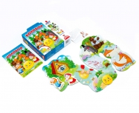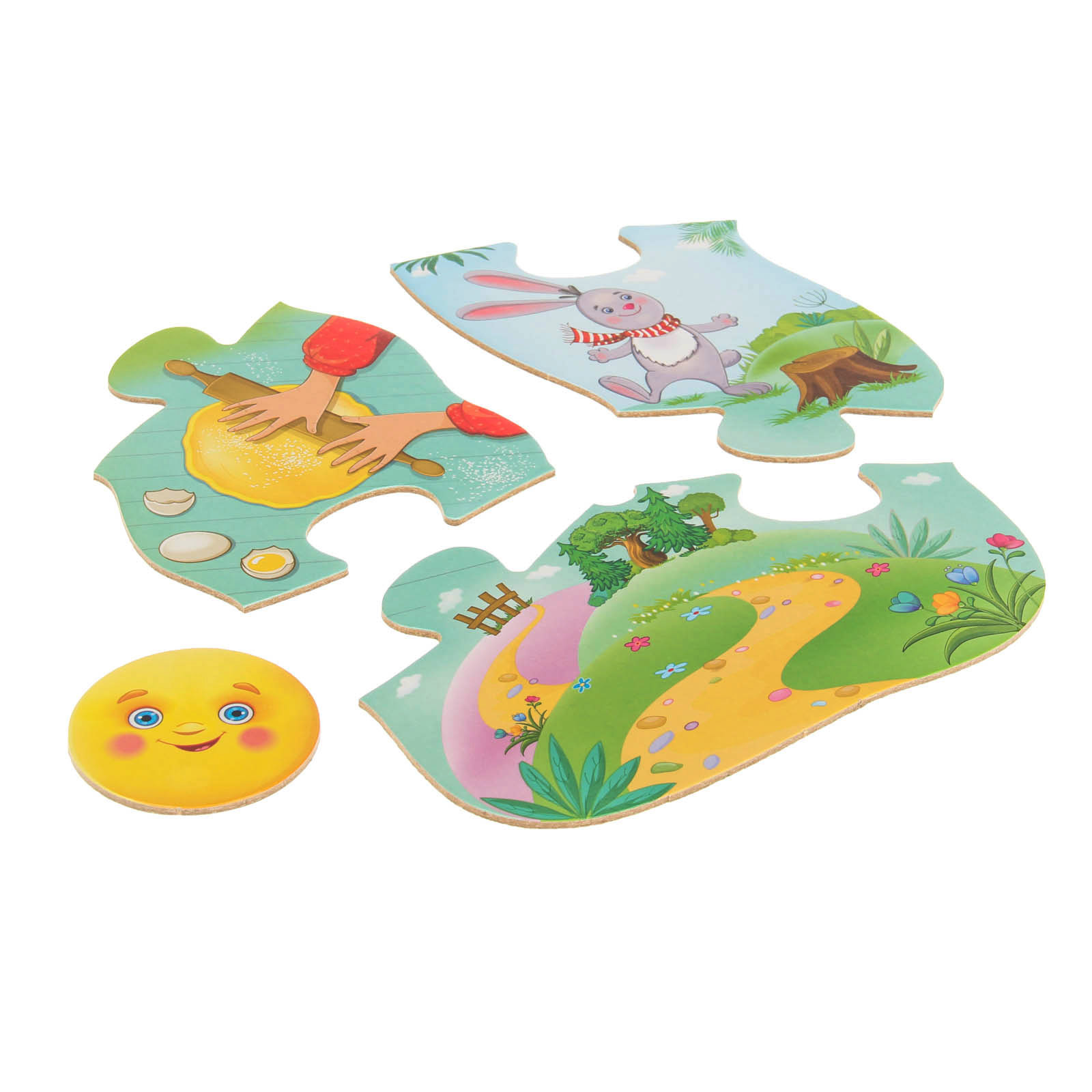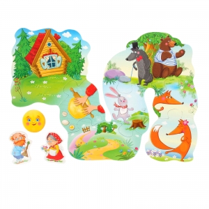 Комплект: 8 деталей пазла, 3 картонных фигурки, сказка.