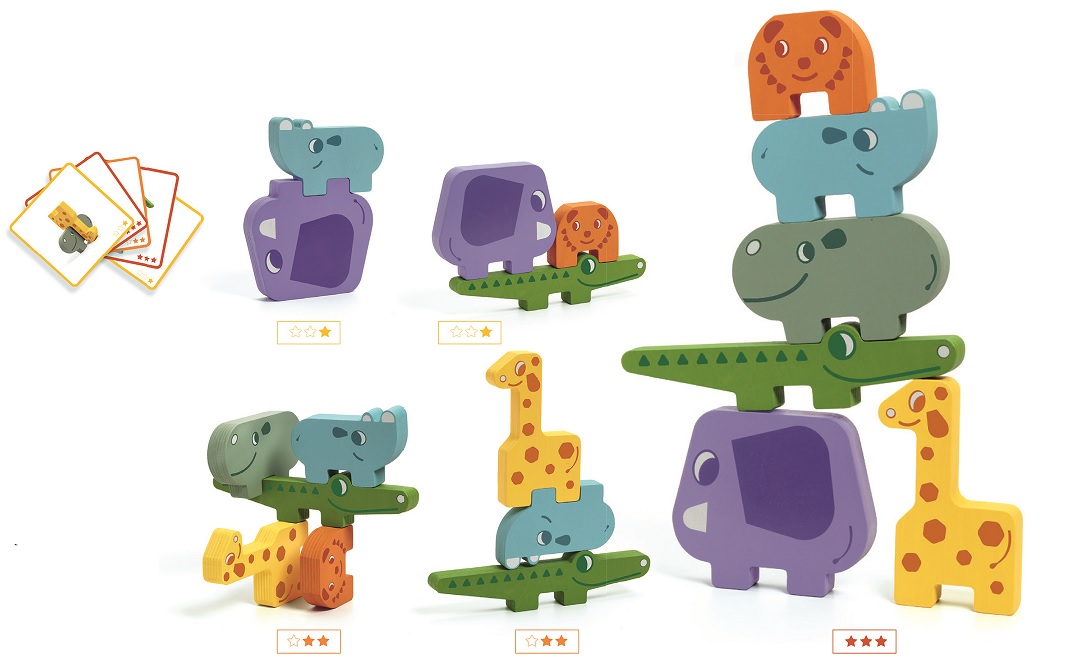 В комплекте: 20 карточек с заданиями разного уровня сложности, 6 деревянных фигурок животных для строительства разных пирамидок