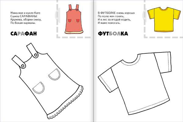 Раскраска "Летняя одежда" содержит изображения: платье, шорты, юбка, сарафан, футболка, панама, кепка, сандалии.